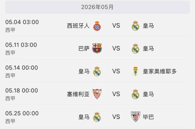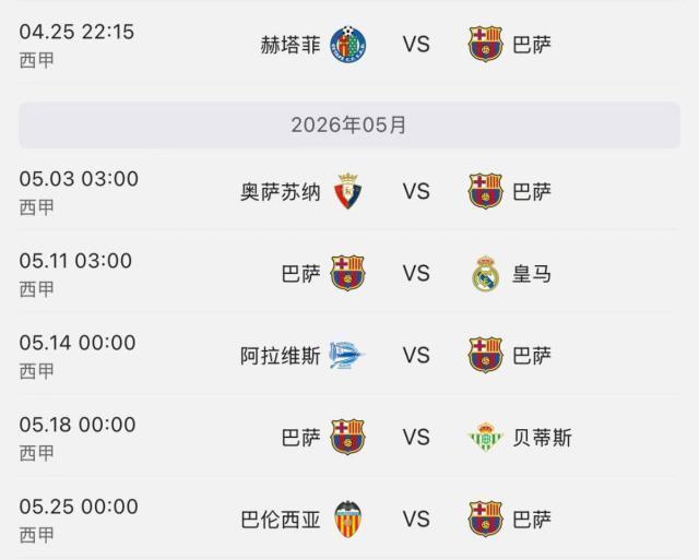 皇马接下来两场比赛都是作客巴塞罗那,先是5月3日对阵西班牙人,7天后在诺坎普迎来“国家德比”。巴萨将于周六晚作客赫塔费,如果获胜将把领先优势扩大至11分。而到了5月10日的国家德比,有可能出现戏剧性一幕:巴萨一旦战胜皇马,将直接锁定冠军。在巴萨队史上,此前还从未出现过主场击败皇马直接联赛加冕的情况。